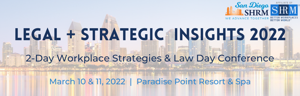 San Diego SHRM is excited to announce our Legal + Strategic Insights Conference— a reinvented two-day workplace strategies and law day conference. This conference will not only provide you with a legal update and forecasting; we will also provide you